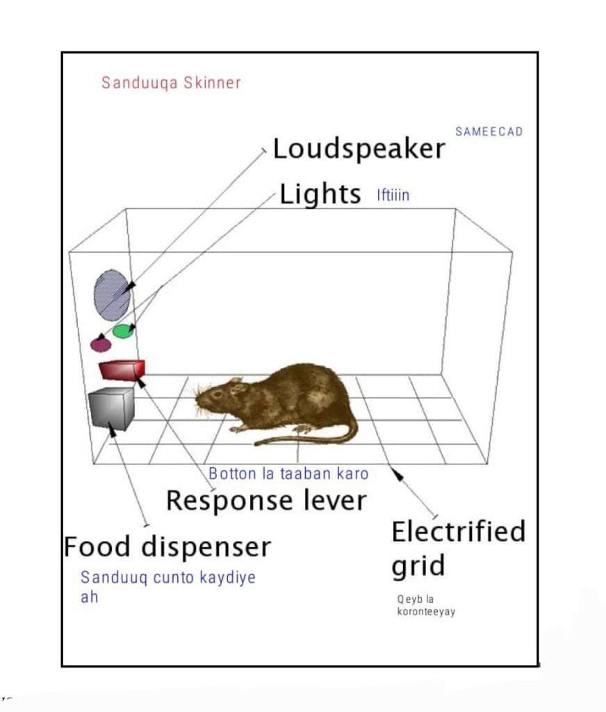 Sida aad uga jeedaan sawirkan sanduuqa skinner(Skinner box) waxa uu innagu tusayaa sida dooligan ula qabsaday bay’ada yar ee uu ku jiro, hadii uu cunto rabo waa inuu taabsadaa bottonka gaduudan sidaasna ayuu ku heleyaa Reward( cunto) sidoo kale dhaq-dhaqaaqa waa laga xaddiday, oo uma baxsan karo dhankaa iyo midigta, waayo waa ay korontaysan tahay(punishment) dhaq dhaqaaqyadan waxay ay geleyaan miyirka qofka, sidaasna ay uga mid noqonayaan dhaqamadiisa.