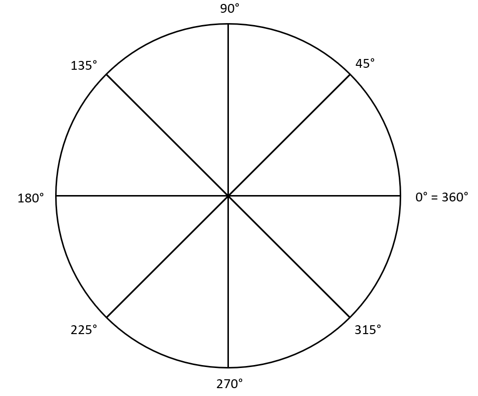 Aqoonta dhulcabbirka, tirida xaglabeegga waxa ay dhigdhexadu u dhigantaa nusgoobada–xagal toosan– miisaankeedu yahay 180°, taas oo curad u ah afarta xaglood ee Daacsan, Qumman, Fiiqan iyo toosan(nusgoobo). Iyaga oo 0° ka bilaabma waxa ay ku kala cabbirmaan: 45°(Fiiqan), 90°(Qumman), 135°(Daacsan) iyo 180°(Toosan–nusgoobo).